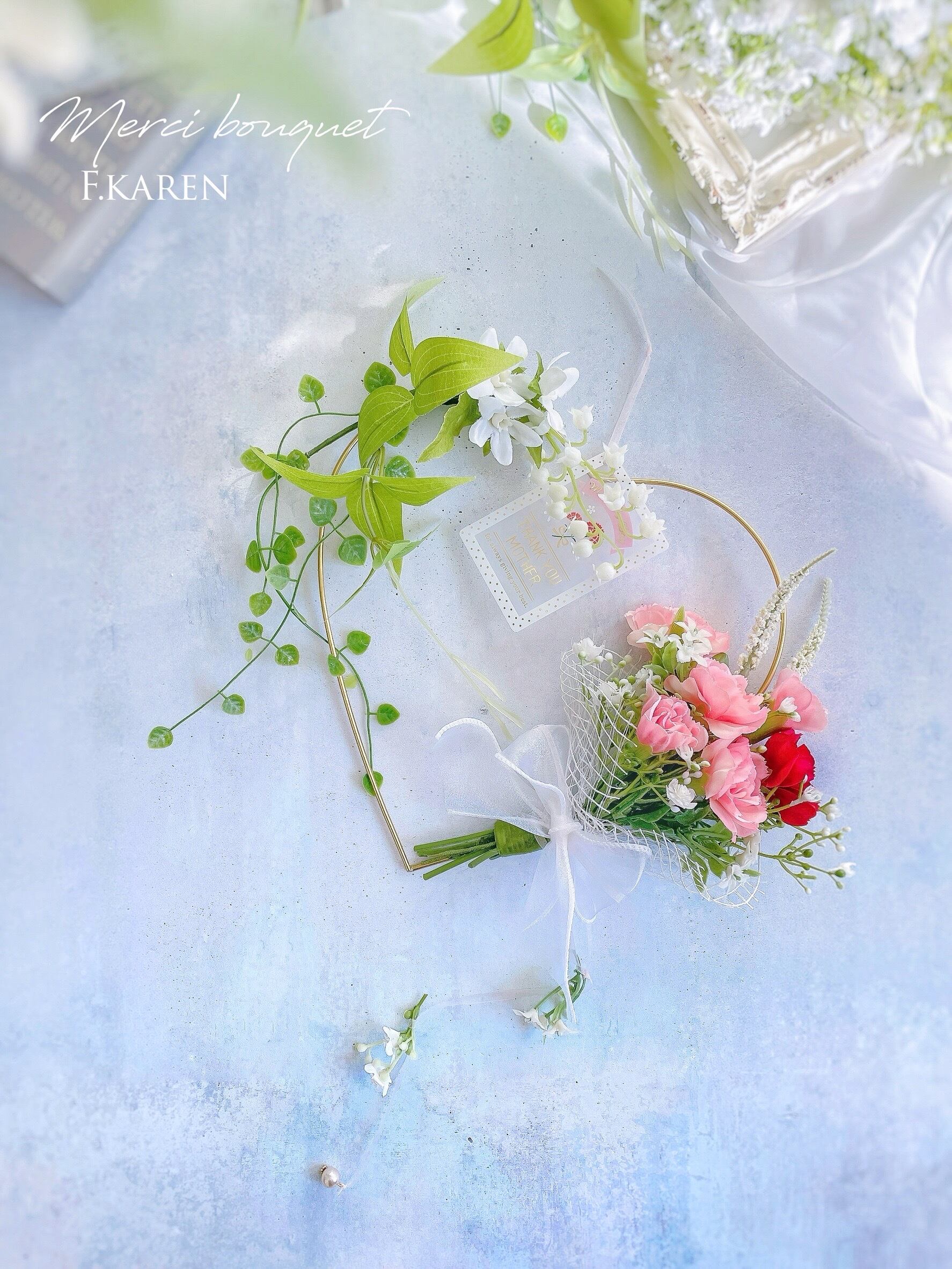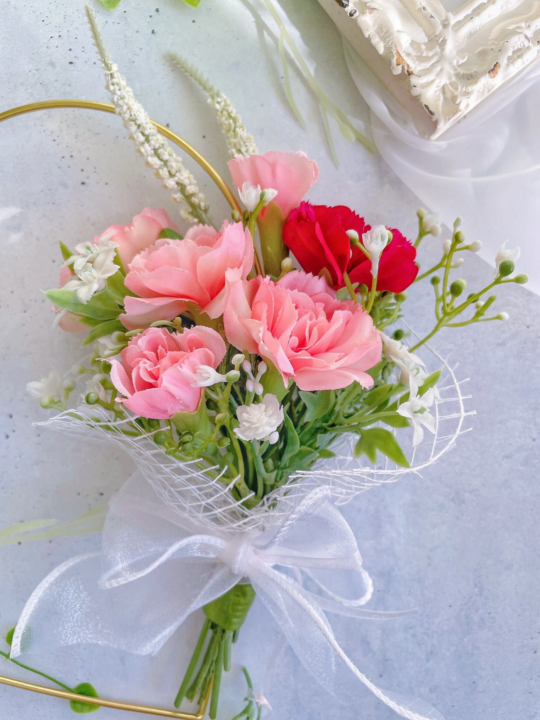 ・カーネーションをオシャレな花束に束ね、リングリースに付けました