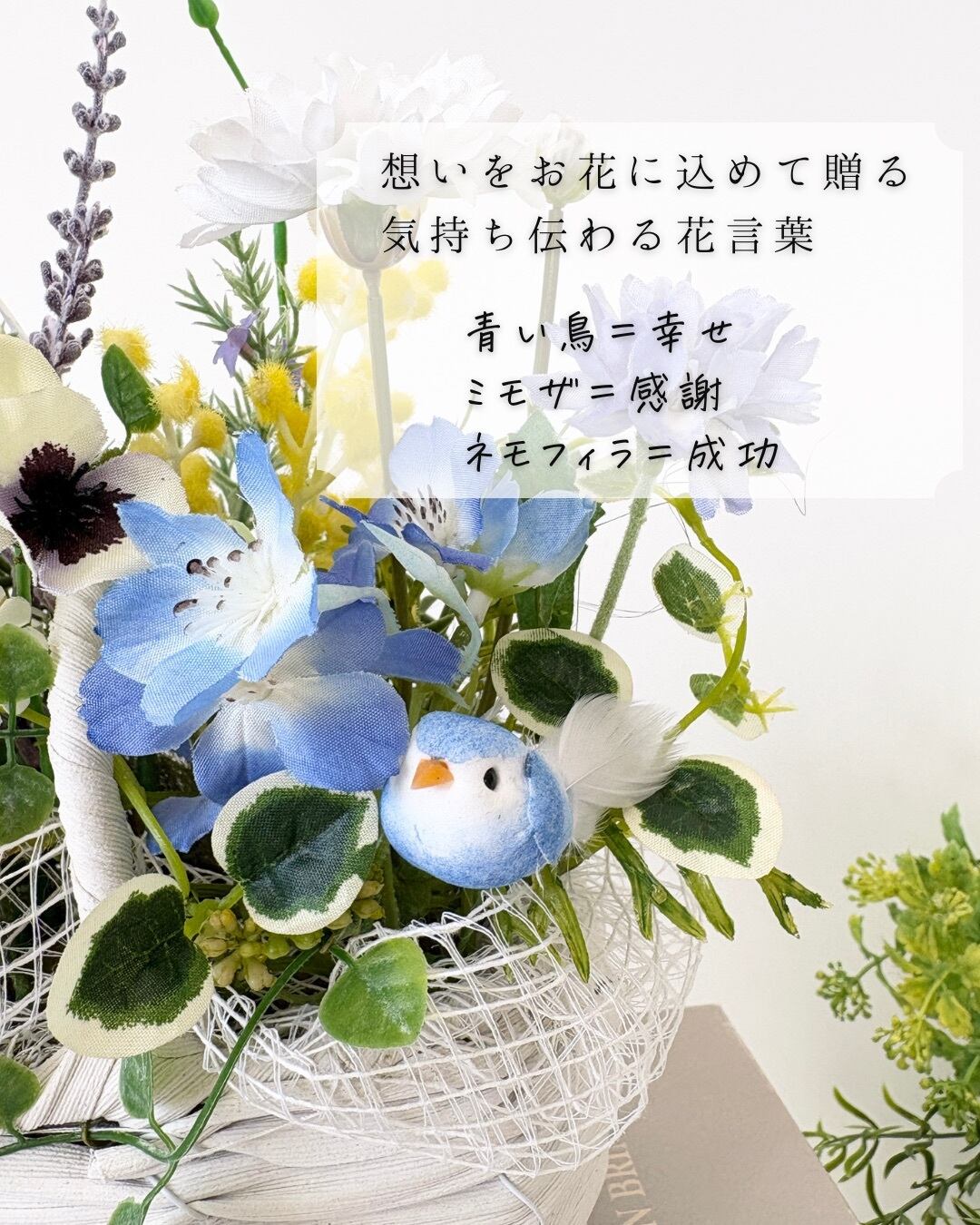 ・アーティフィシャルフラワー:ネモフィラ、ビオラ、マトリカリア、コーンフラワー、ミモザ、スイートピー、等