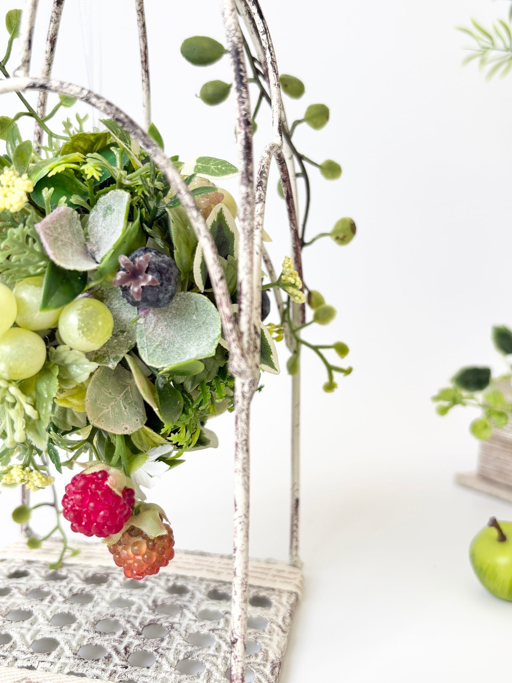 アンティーク調の白い鳥かごの中に、みずみずしいグレープやラズベリー、ブルーベリーをぎゅっと詰め込んだ、贅沢な「フルーツボール」を吊るしました。