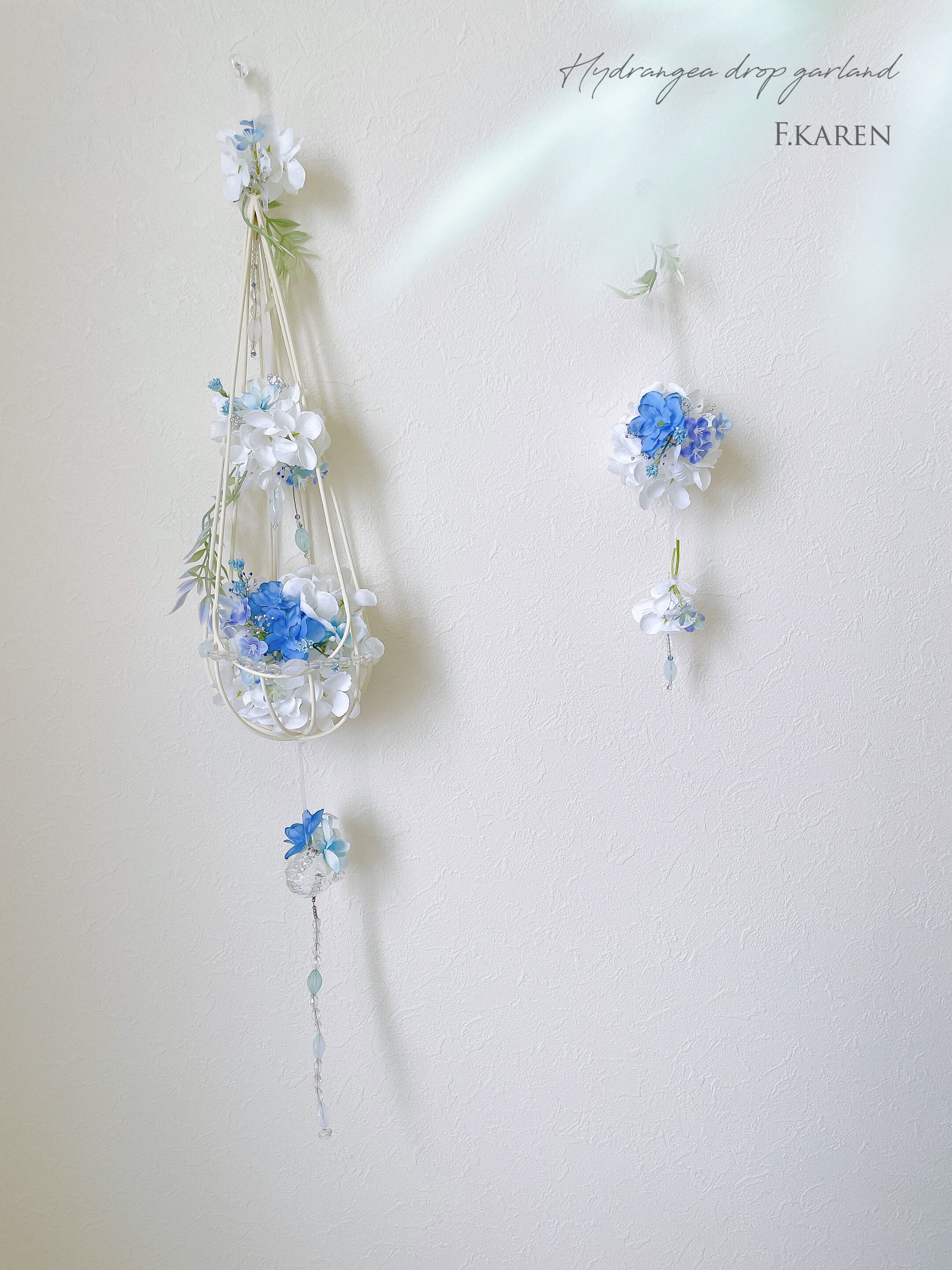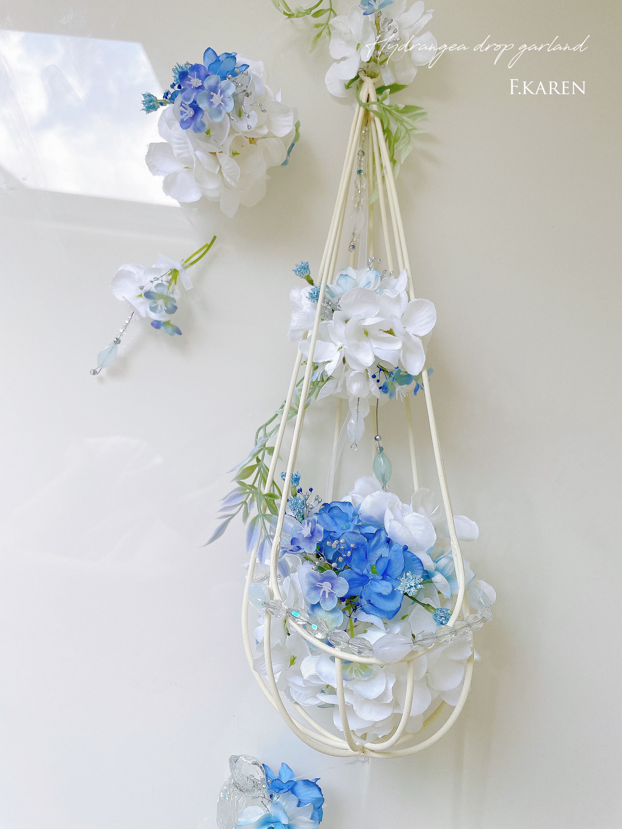 ラタンボールにまんまるくアレンジしたボールガーランドを、ドロップ型のワイヤーハンギング花器に合わせました