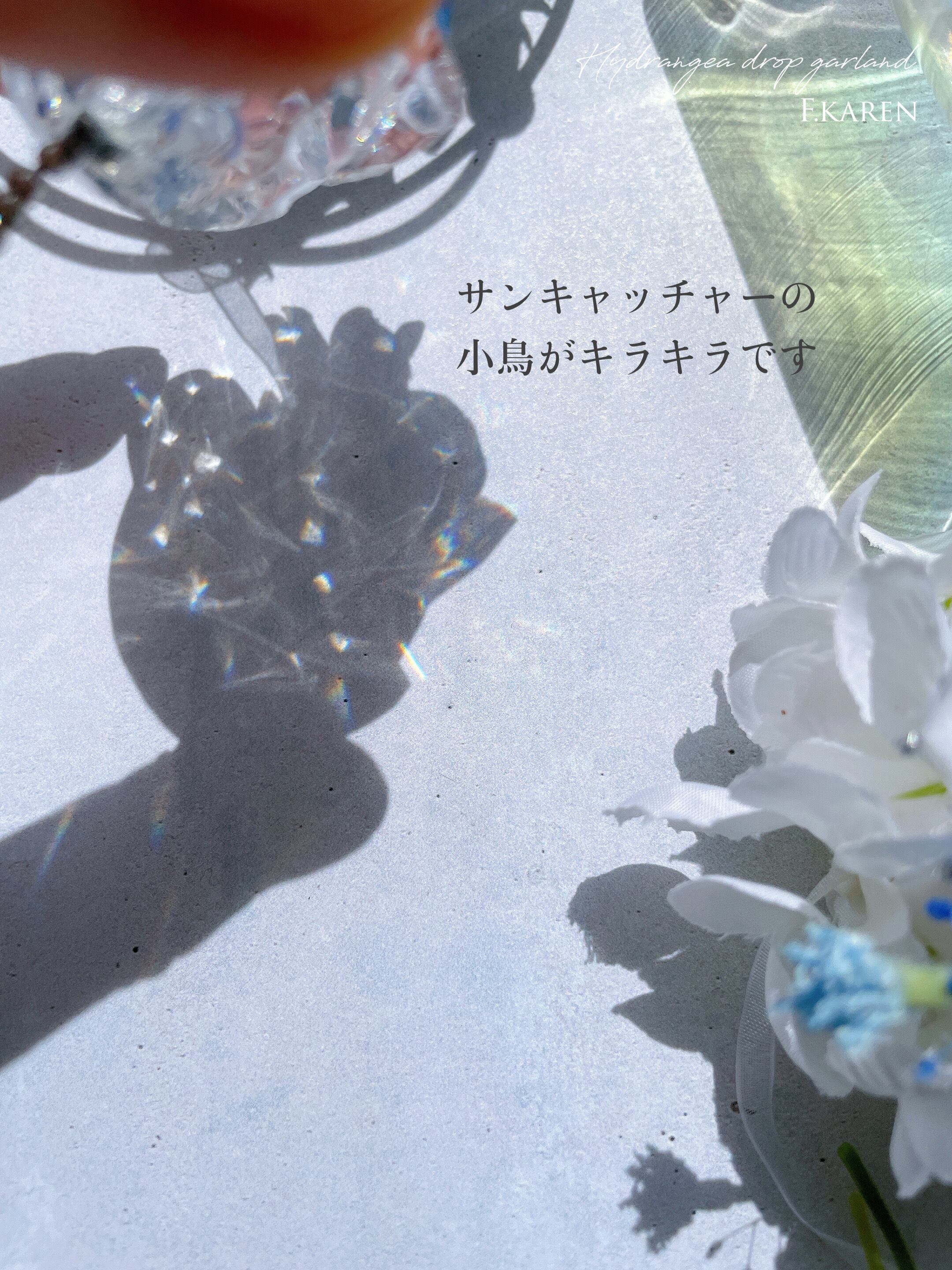 サンキャッチャーの小鳥が光を浴びるとキラキラ輝きます