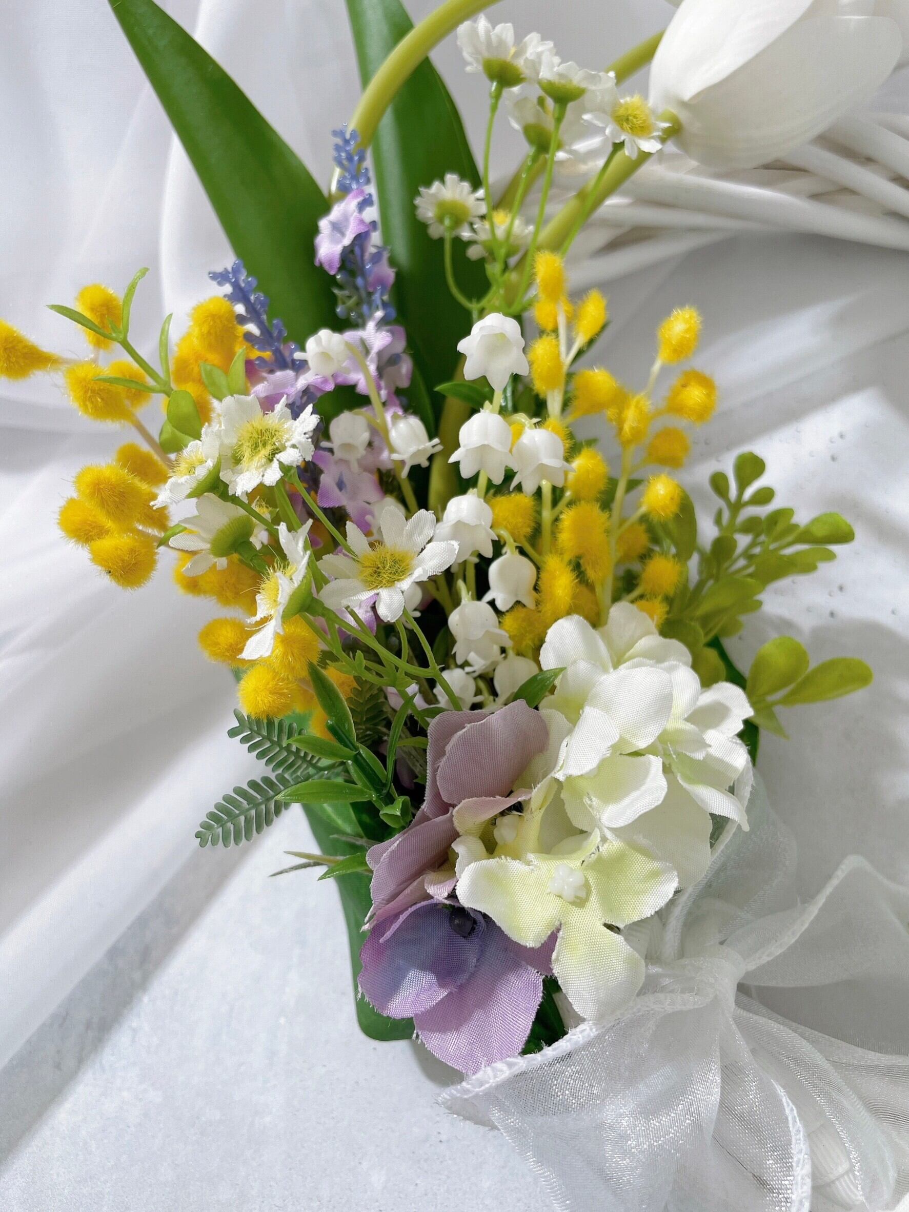 左サイドは、チューリップやミモザ、スズラン、カモミール等をブーケ風に