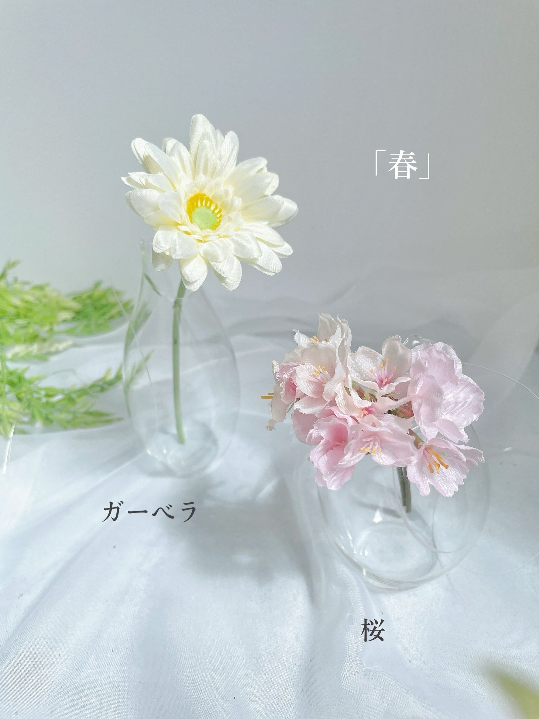サクラ、ガーベラ、アジサイ、カスミソウ、デルフィニウム、コスモス、パンパス、等