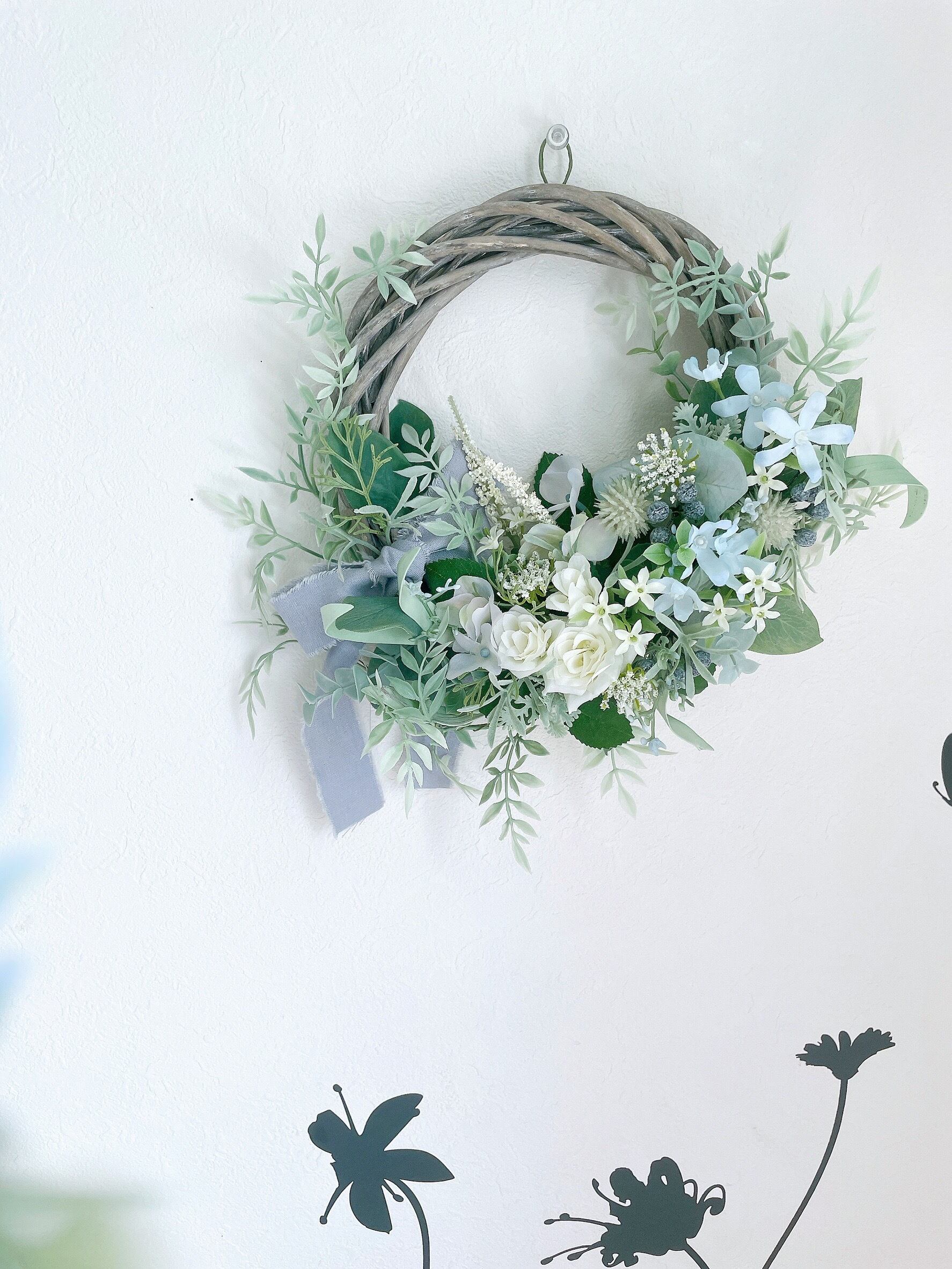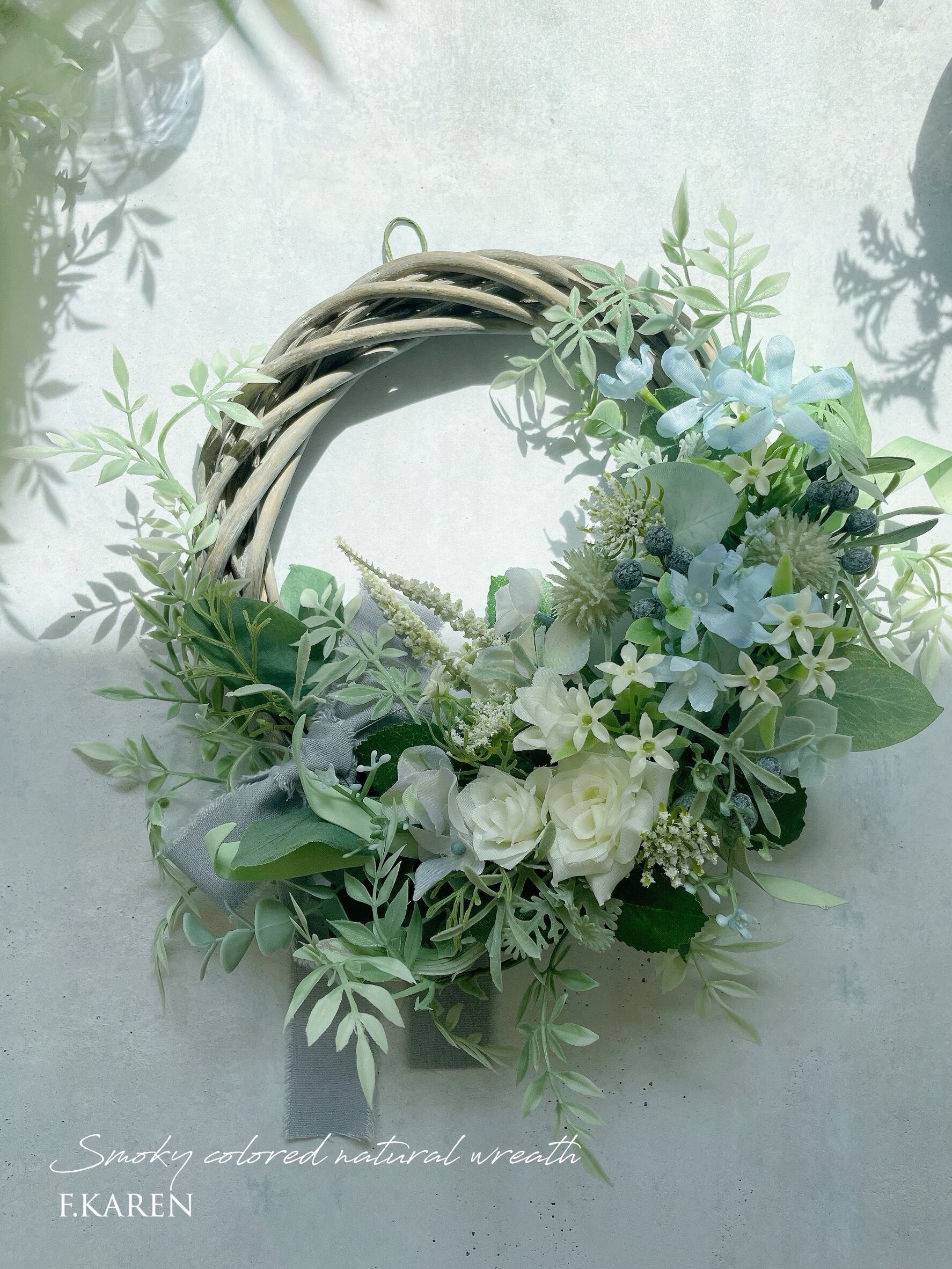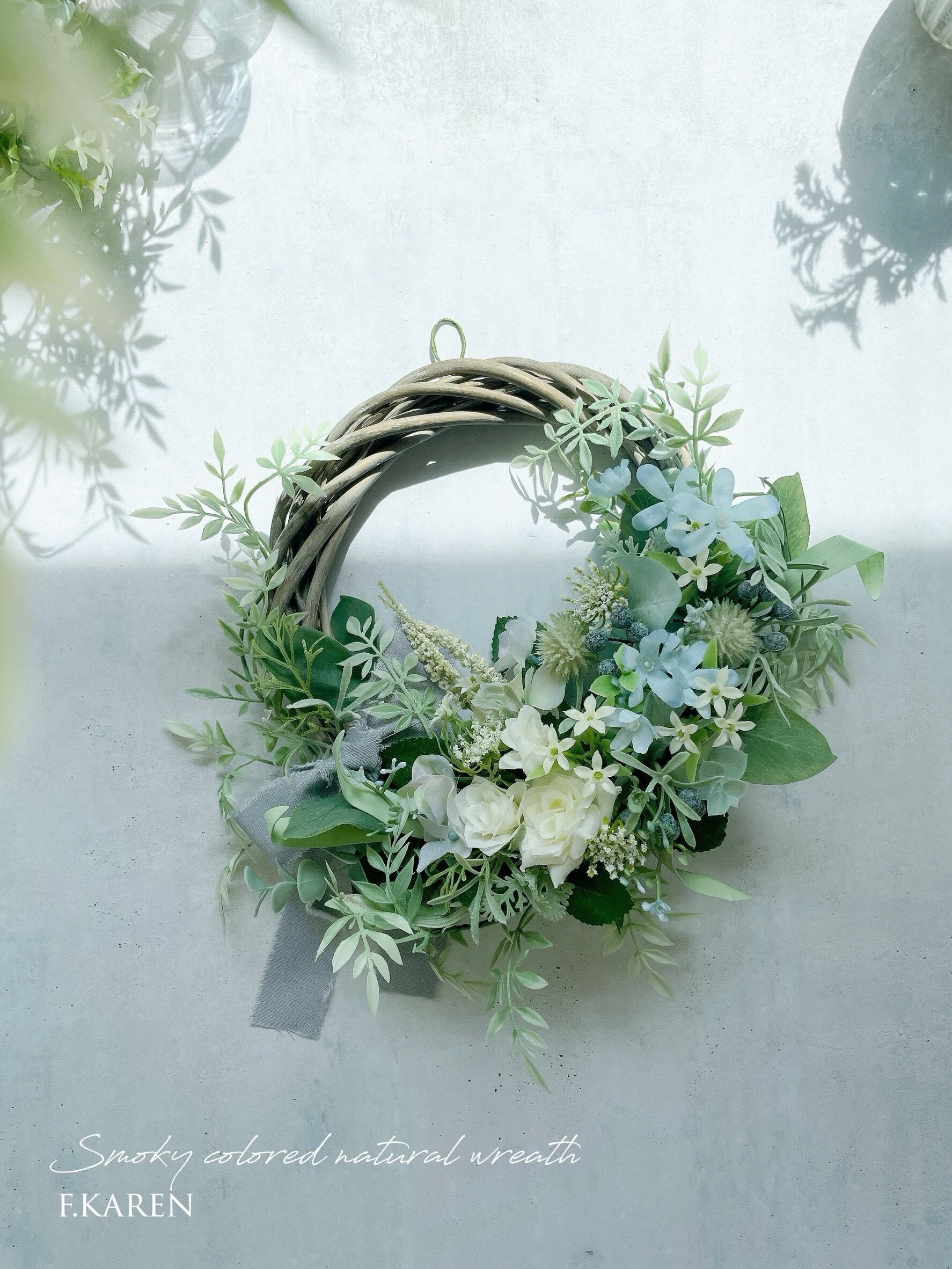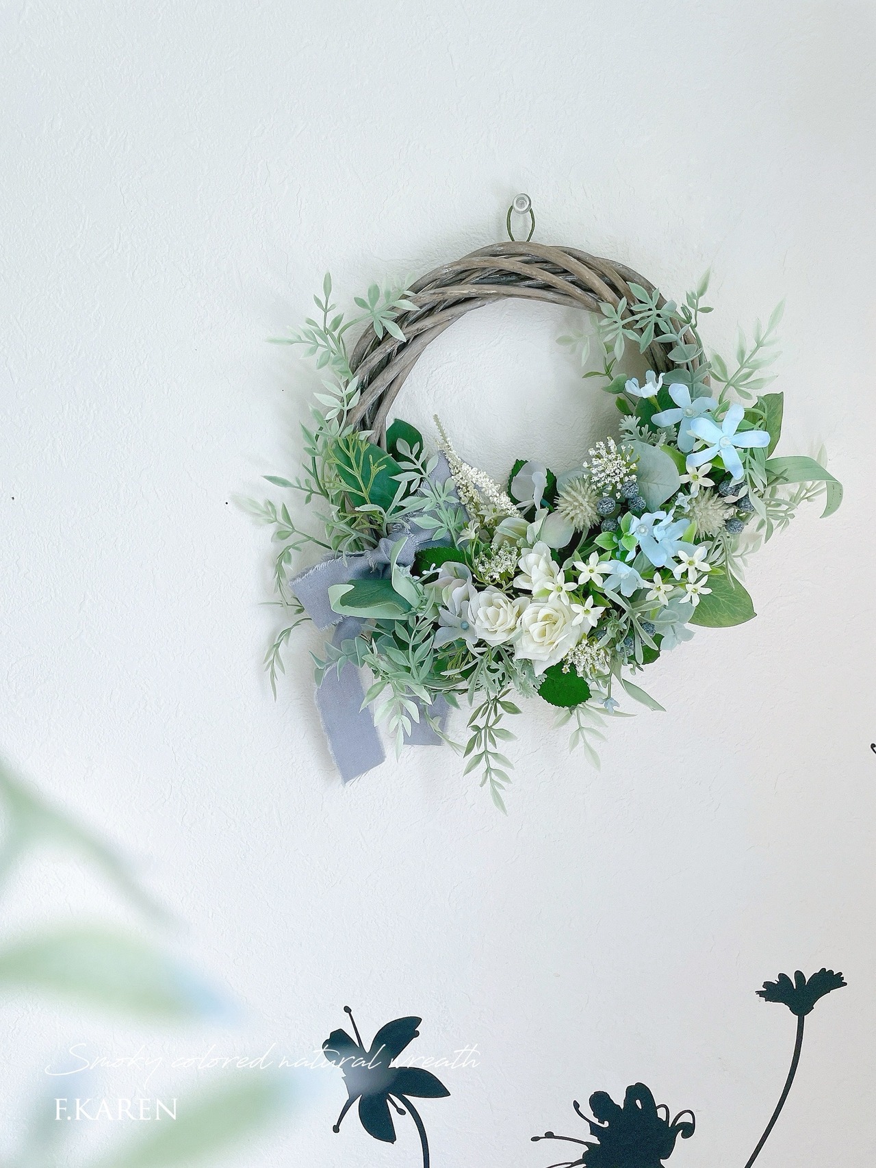 ナチュラルリース*スモーキーカラー*ローズ、ブルースター、ラベンダーの造花リース ~光触媒加工~