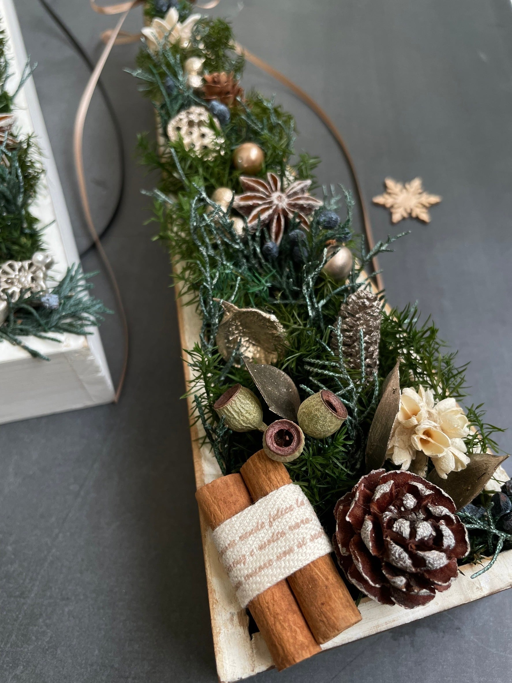 フラワーコーン、スターアニス、シナモンスティック、シダローズ、ユーカリの実、ハニーテール、ナンキンハゼ、ミニハス、カネラ等の木の実