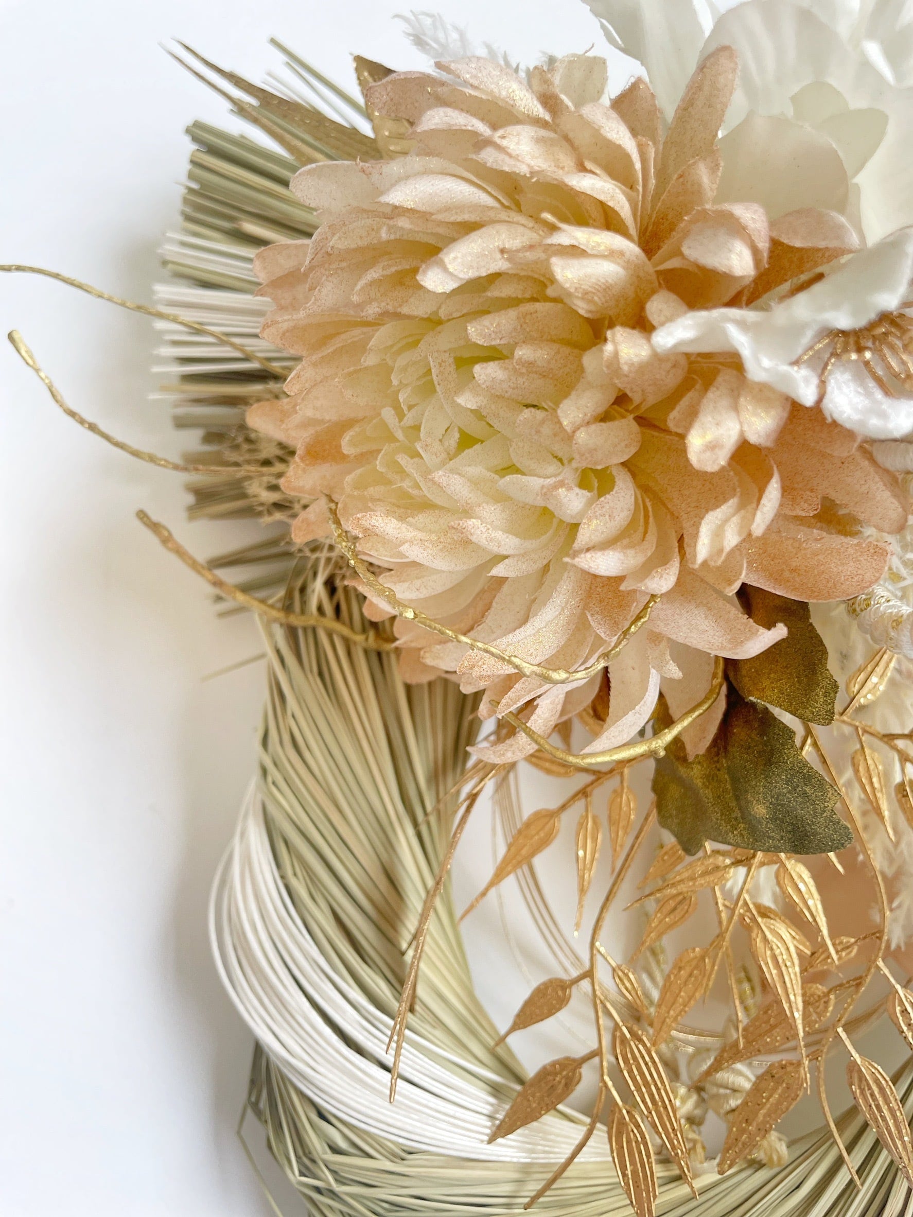ラメがかったベージュのマム、ドライタッチのピオニー(芍薬)、ベルベットの梅やゴールドの笹、ルナリア(マネープラント)等、豪華花材をたっぷり使用