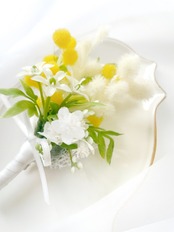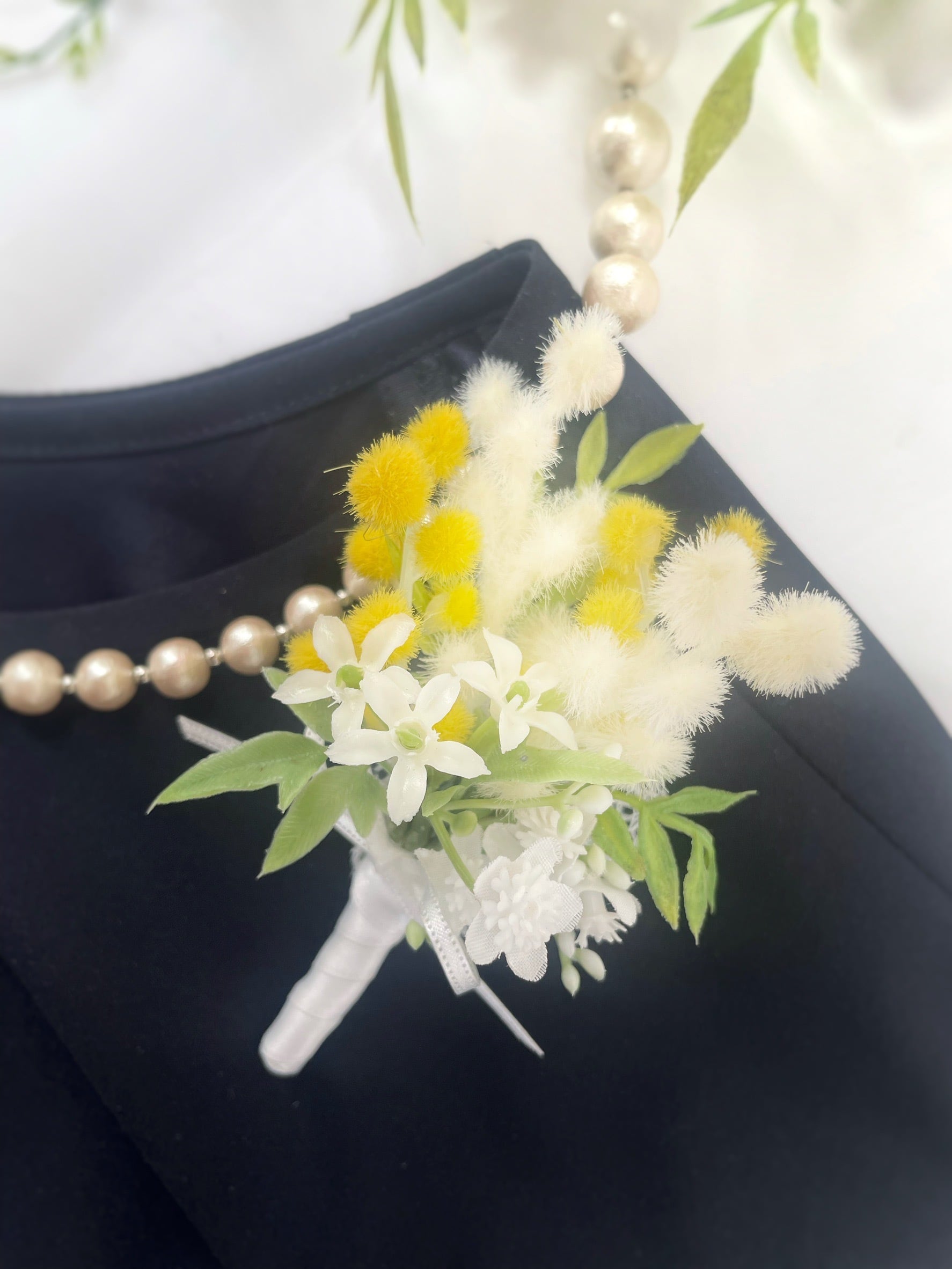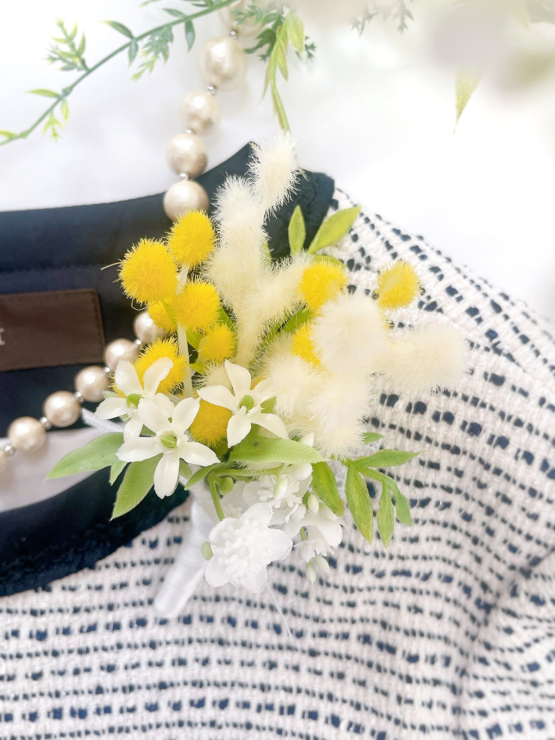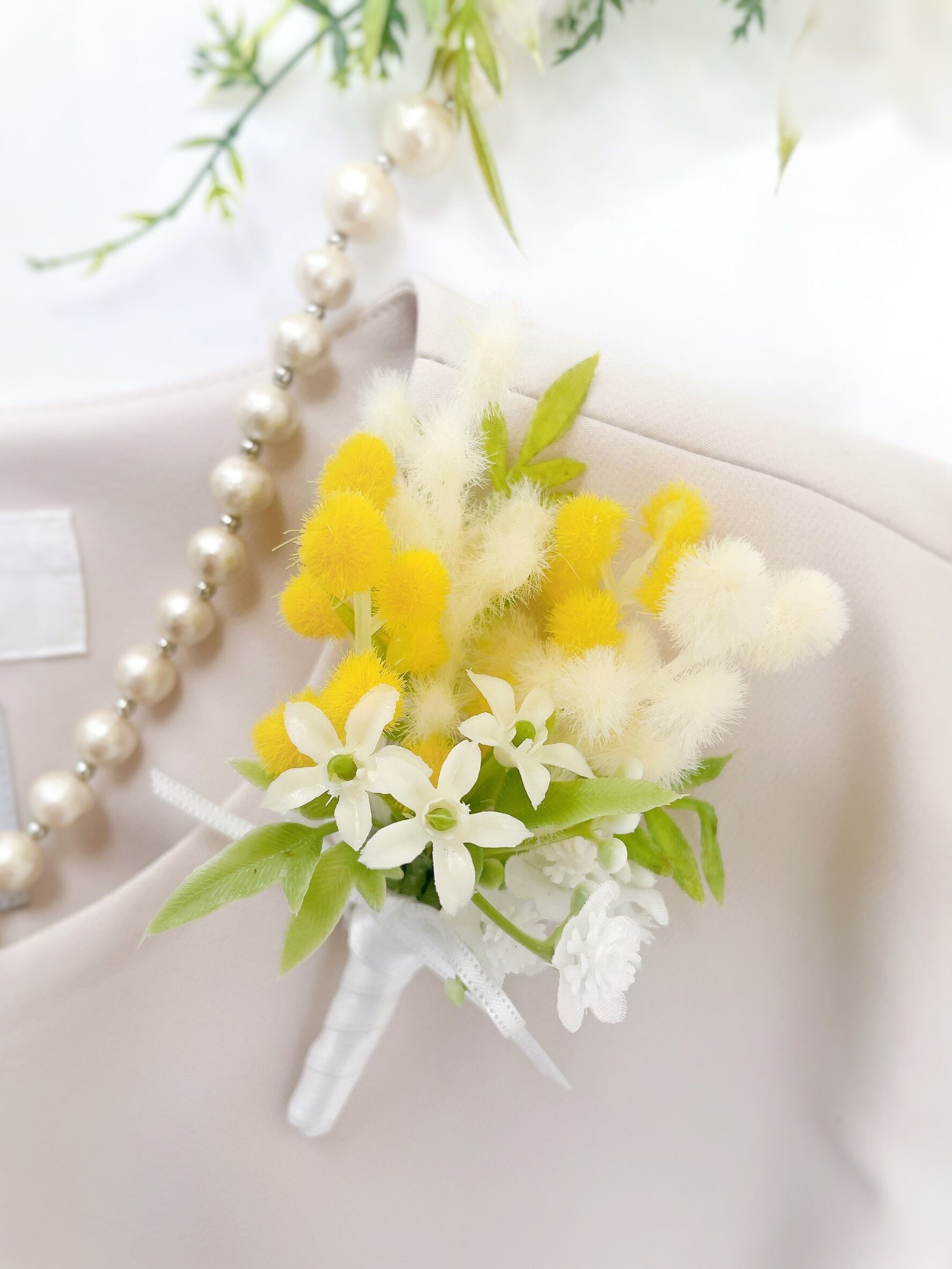希少な白ミモザのブーケコサージュ~光触媒加工~