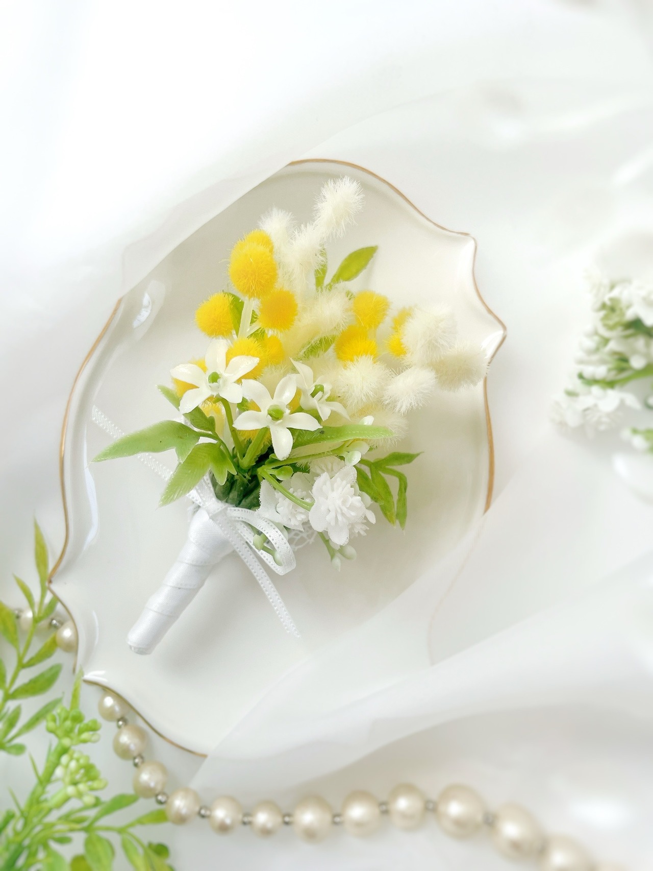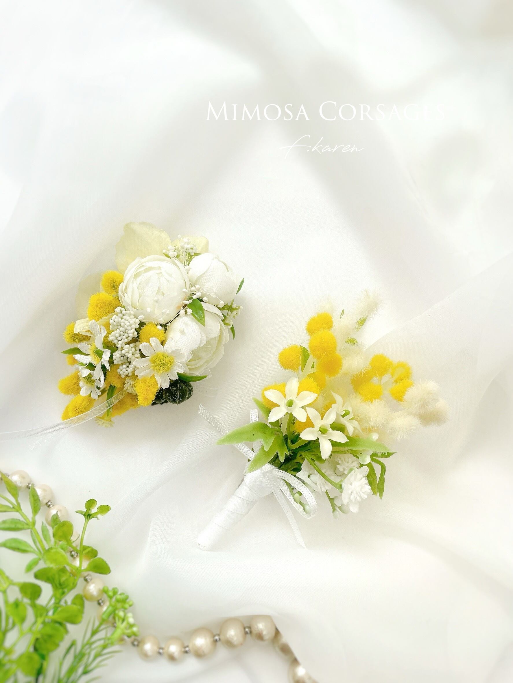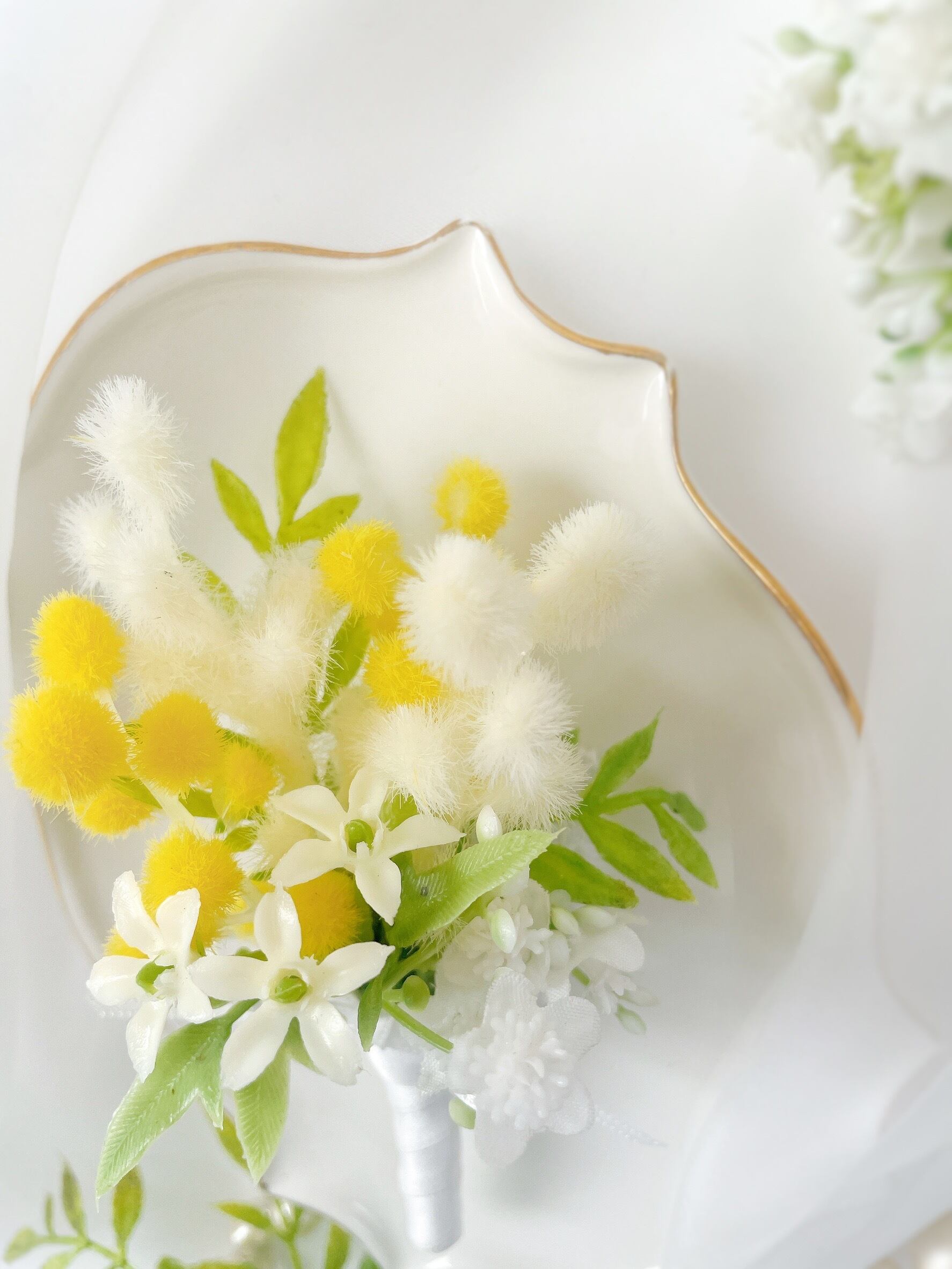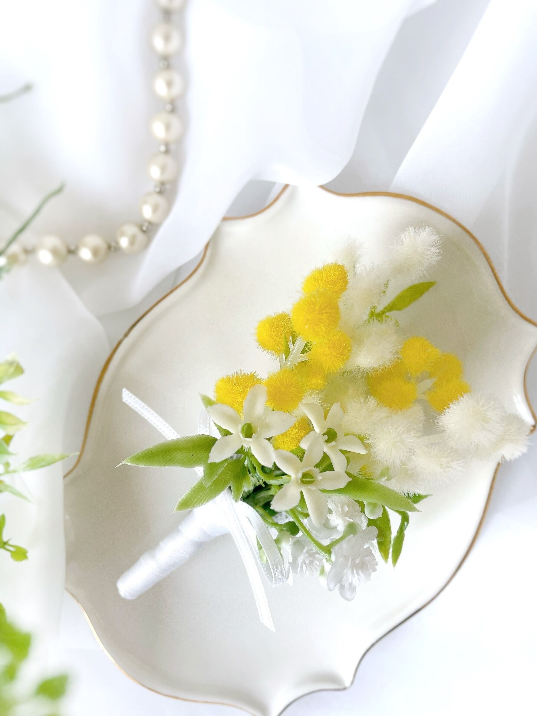 希少な白ミモザのブーケコサージュ~光触媒加工~